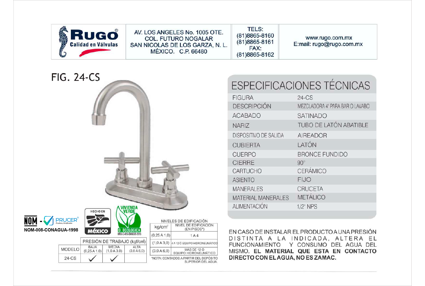 MEZCLADORA PARA LAVABO TIPO BAR de RUGO es un producto profesional. MEZCLADORA PARA BAR 4″ A. SATIN