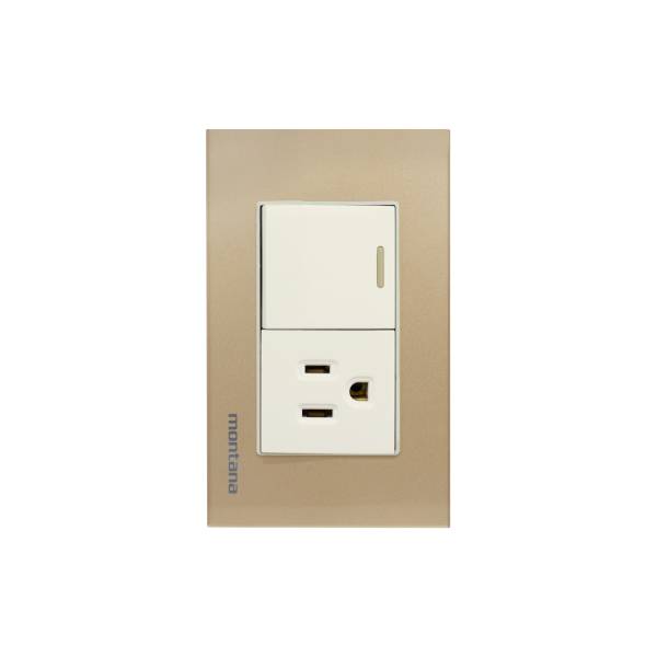 Placa 2 ventanas con apagador sencillo y contacto 2p+t dorado Krystal Montana