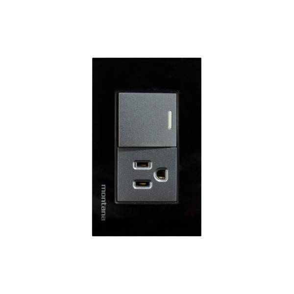 Placa 2 ventanas con apagador sencillo y contacto 2p+t negro Krystal Montana