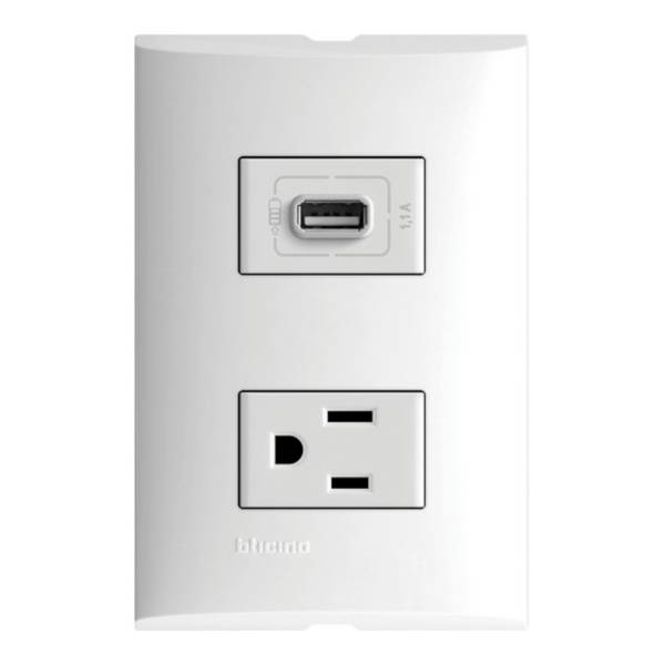 Placa con 1 tomacorriente 2P+T 15A 127V, + 1 cargador USB 1.1A, color blanco.