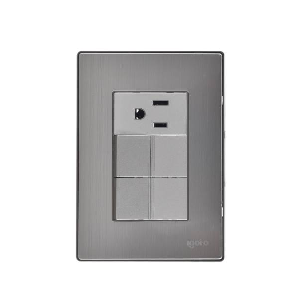 Placa 3 ventanas con 2 apagadores sencillos y contacto 2p+t plata Inox Igoto