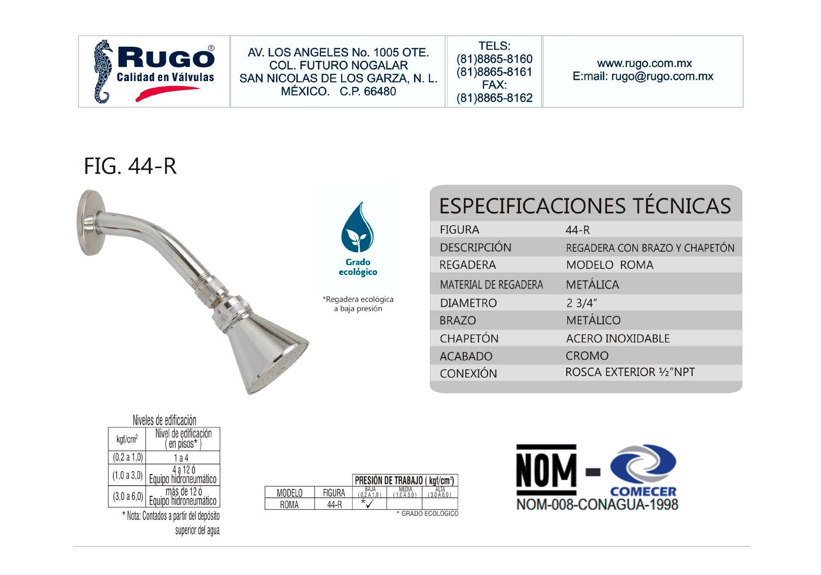 REGADERA DE 2 3/4”Ø CON BRAZO Y CHAPETÓN de RUGO es un producto profesional. REGADERA ROMA