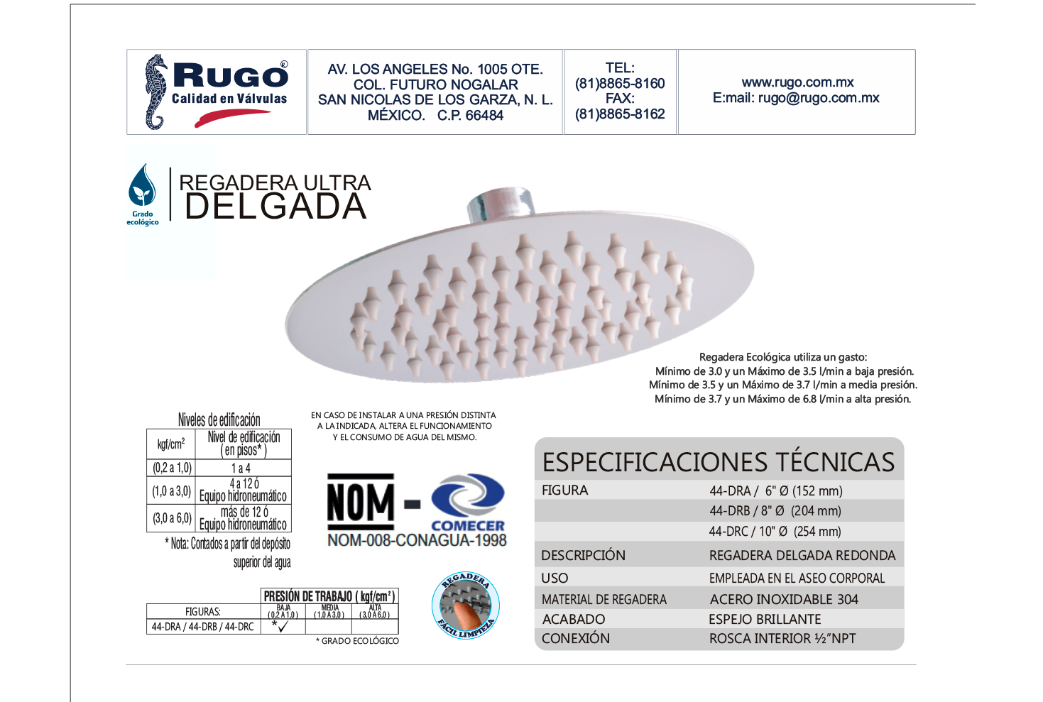 REGADERA ULTRA DELGADA REDONDA DE 10”Ø SIN BRAZO de RUGO es un producto profesional. REG.DELGADA RED.10″ DIAM.AC.INOX.AC.CROMO
